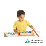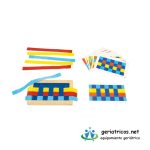 Tissacolor es un juego original de motricidad fina y actividades de decodificación y codificación. Ayuda a desarrollar la movilidad de la muñeca y la destreza de los dedos, y prepara para la escritura gestual. Las 12 tarjetas de doble cara ofrecen 24 actividades organizadas en 8 series. El objetivo del juego: pasar las tiras de tela de colores, una a una, entre las bandas elásticas del marco de madera, primero libremente y luego reproduciendo los patrones de las tarjetas.